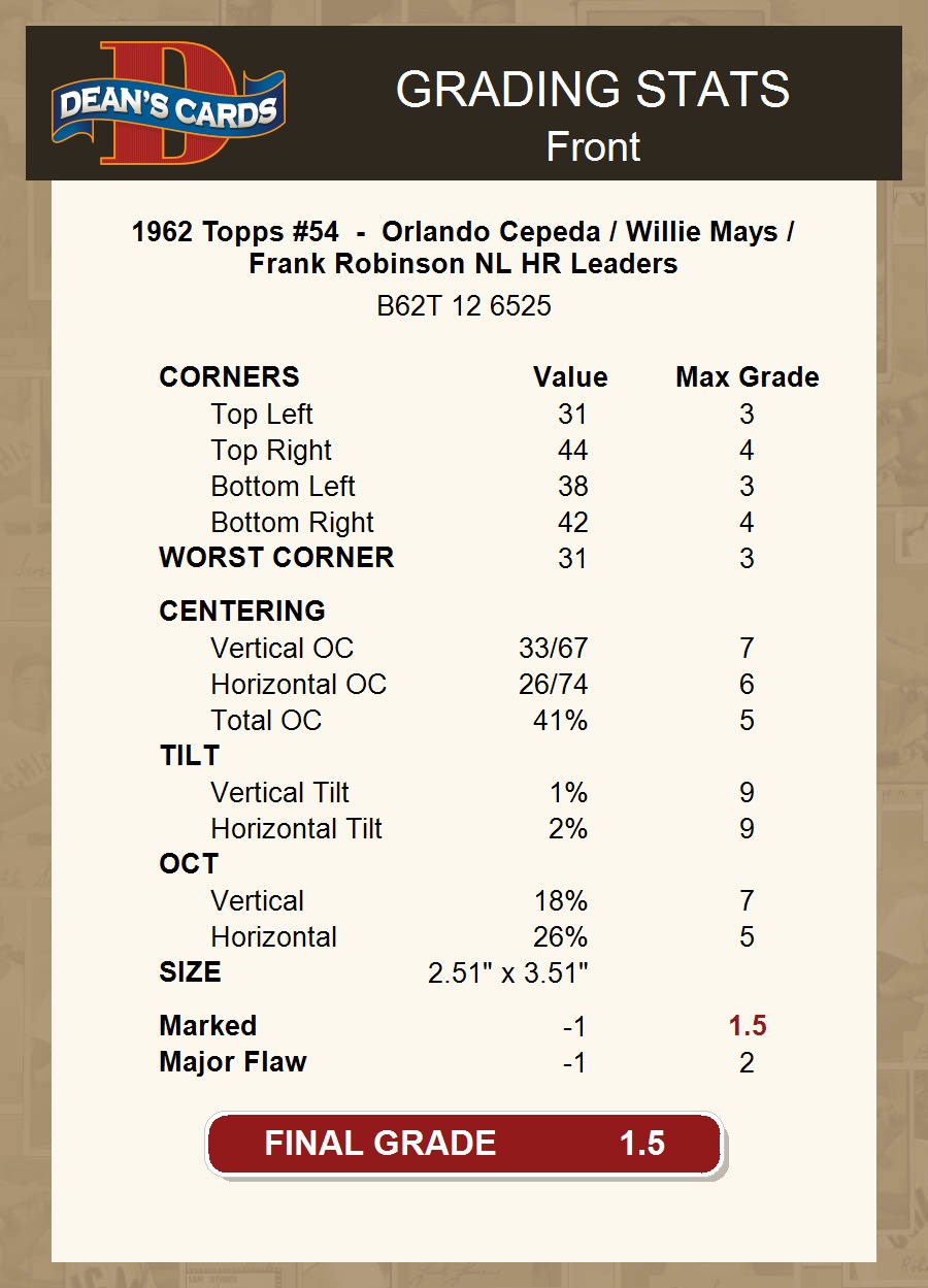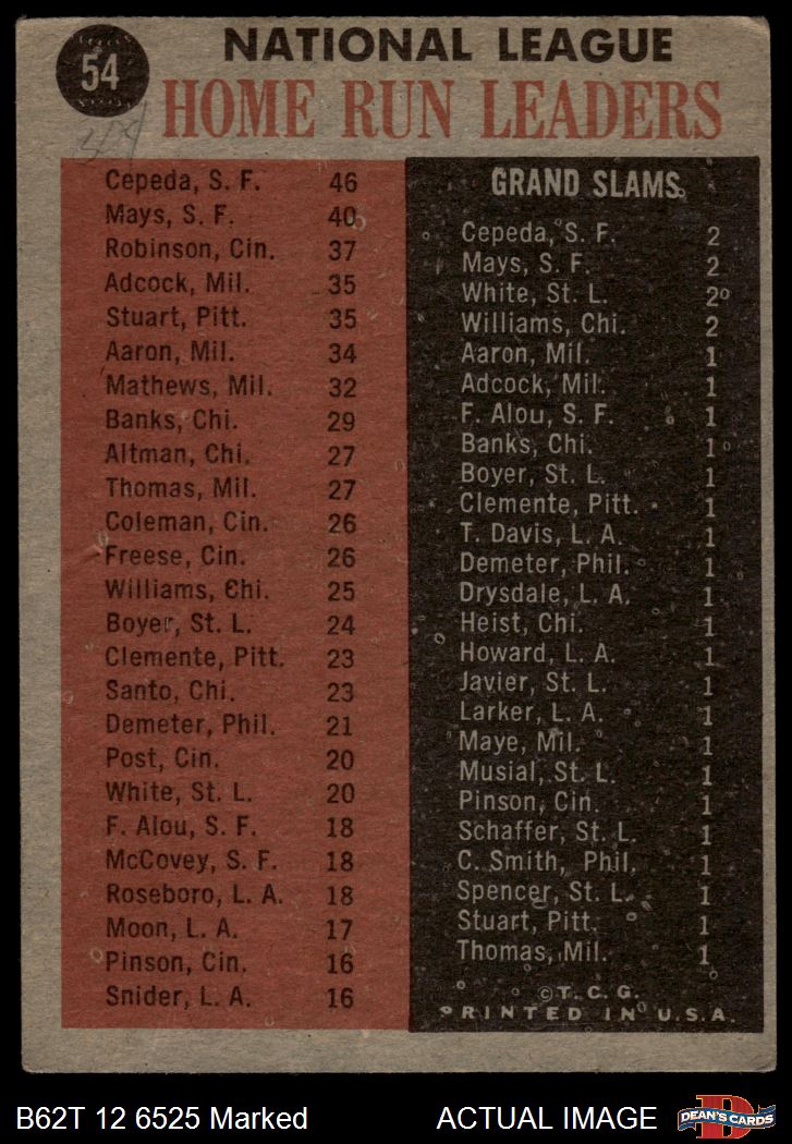 1962 Topps #54 - Orlando Cepeda / Willie Mays / Frank Robinson NL HR Leaders 1.5 - FAIR