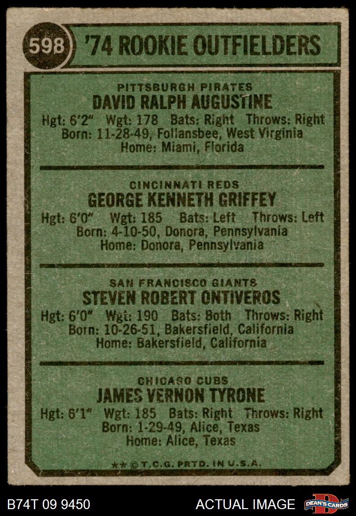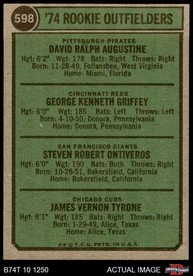 1974 Topps #598 - Ken Griffey / Dave Augustine / Steve Ontiveros / Jim Tyrone Rookie Outfielders 4 - VG/EX
