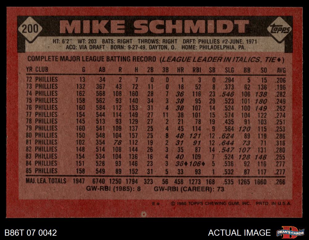 1986 Topps #200 Mike Schmidt 8 - NM/MT