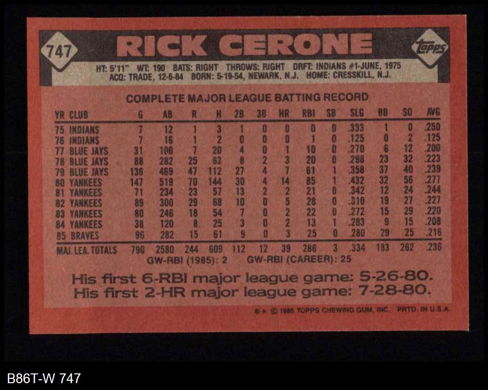 1986 Topps #747 Rick Cerone 8 - NM/MT
