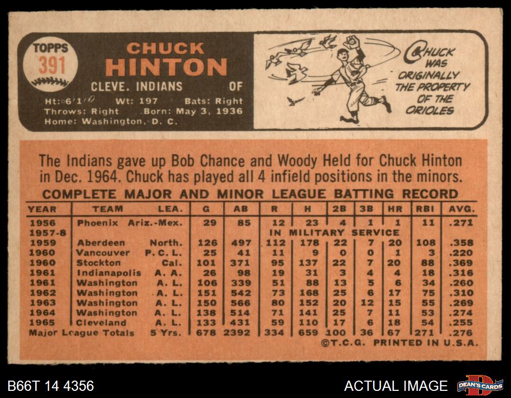 1966 Topps #391 Chuck Hinton 4 - VG/EX