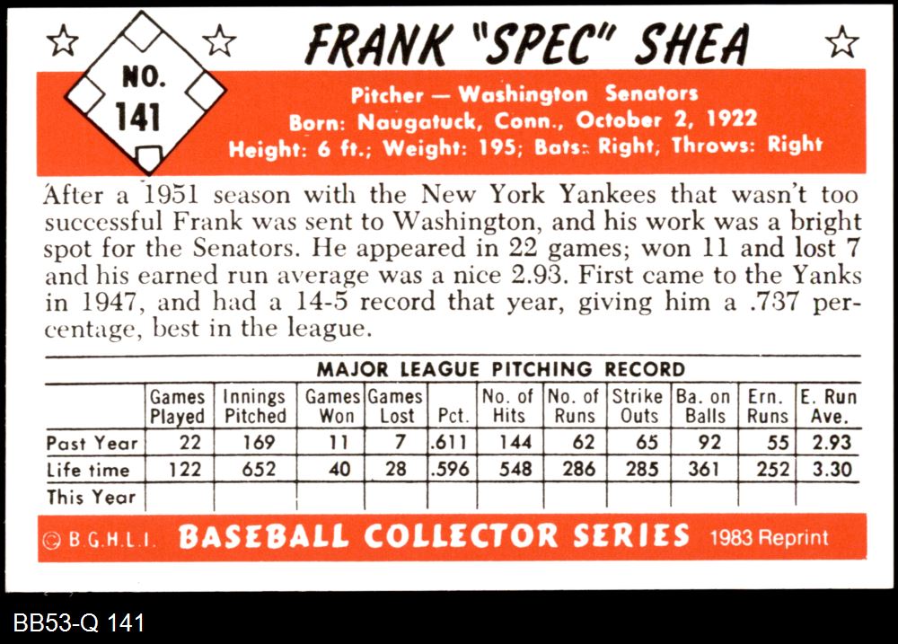 1953 Bowman REPRINT #141 Frank Shea 8 - NM/MT
