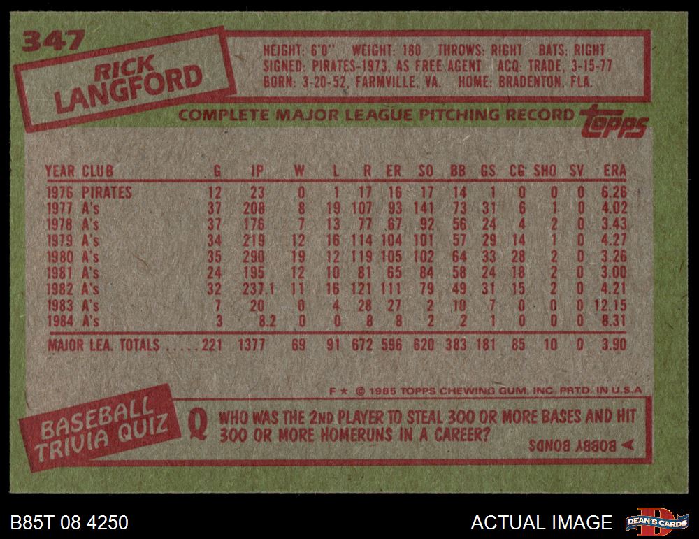 1985 Topps #347 Rick Langford 5 - EX