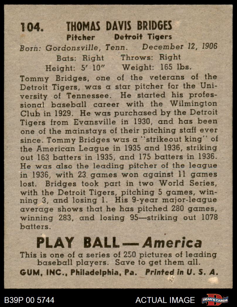 1939 Play Ball #104 Tommy Bridges 7.5 - NM+