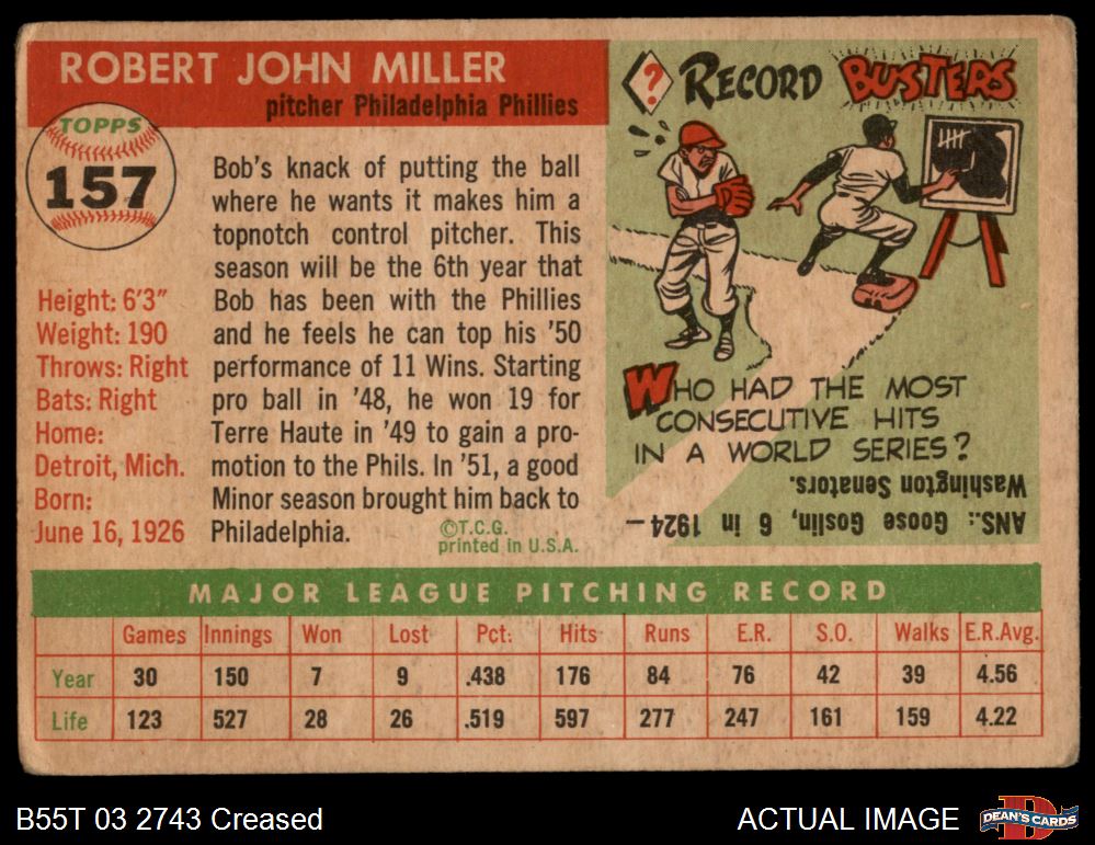 1955 Topps #157 Bob Miller 1 - POOR