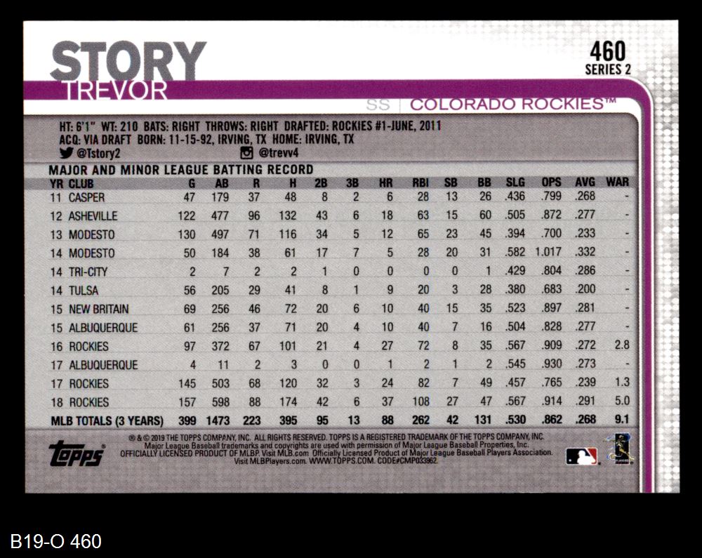 2019 Topps #460 Trevor Story 8 - NM/MT