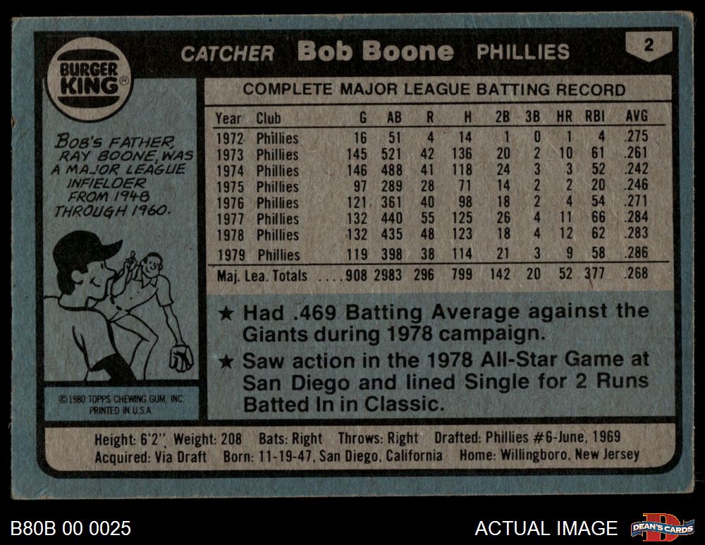 1980 Burger King Phillies #2 Bob Boone 3 - VG