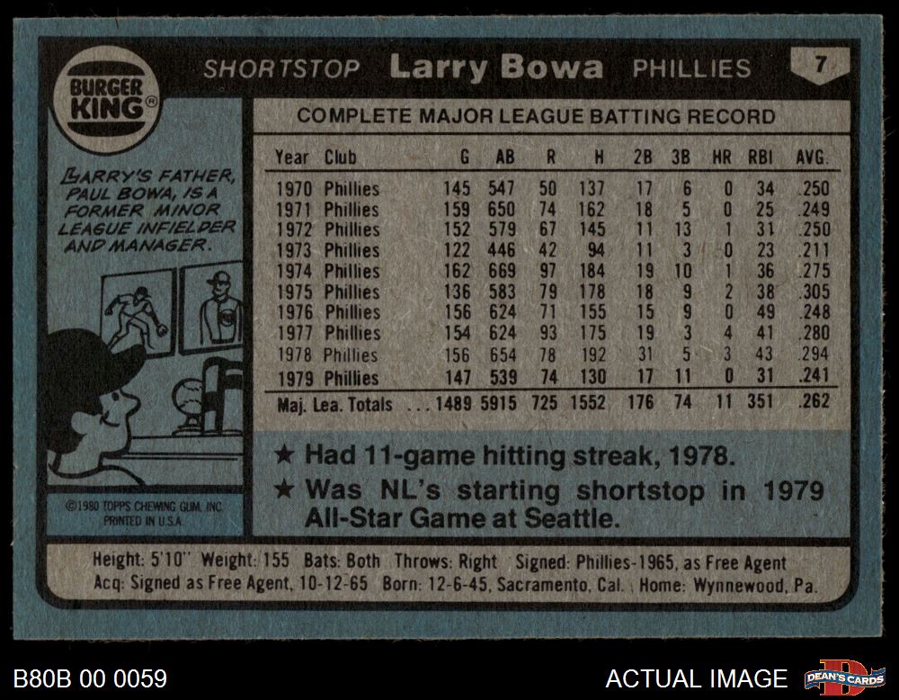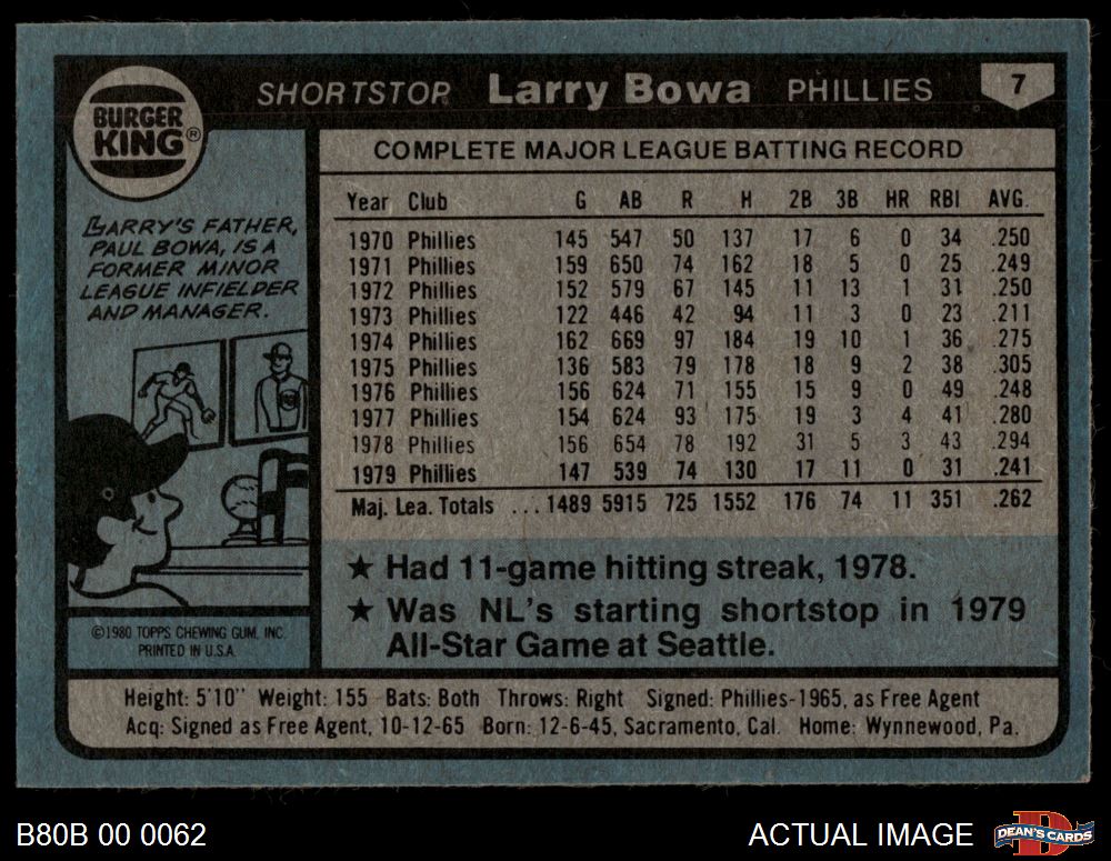 1980 Burger King Phillies #7 Larry Bowa 6 - EX/MT