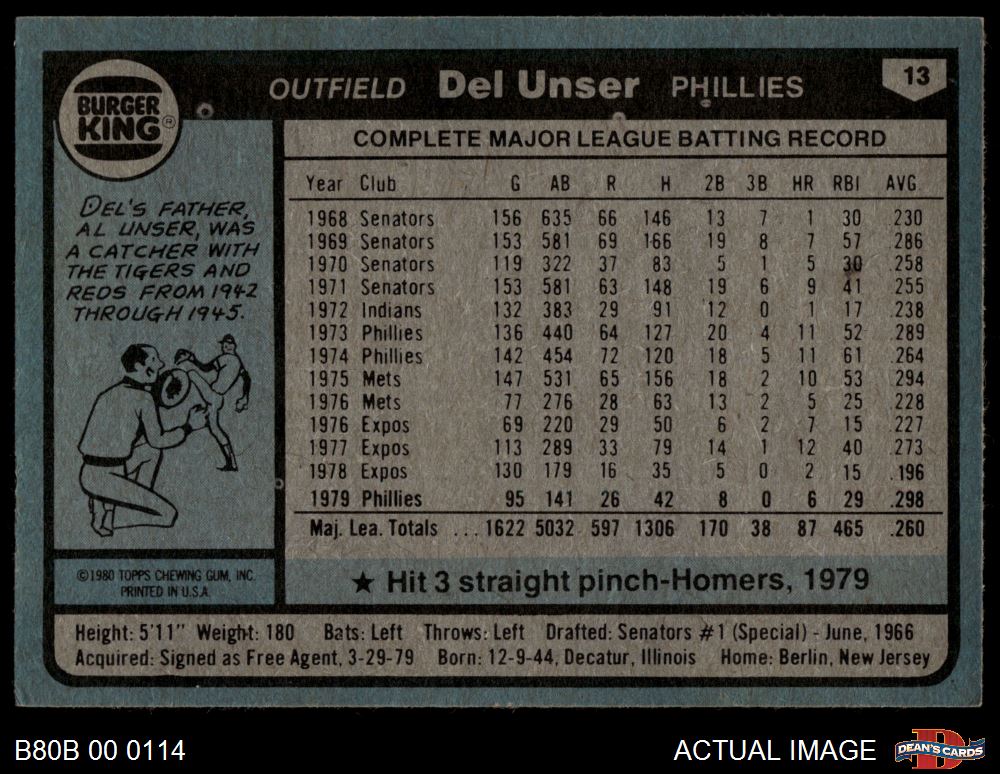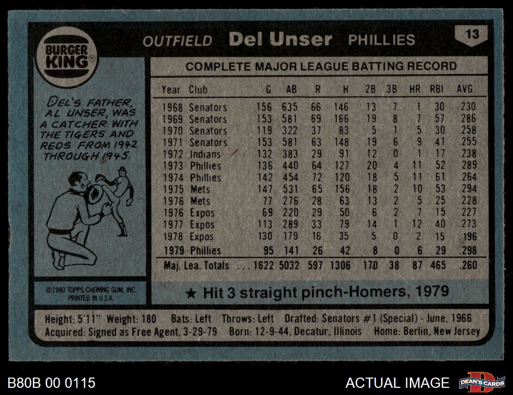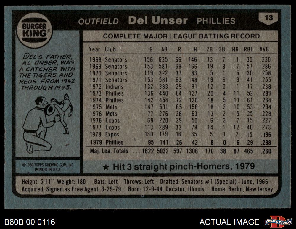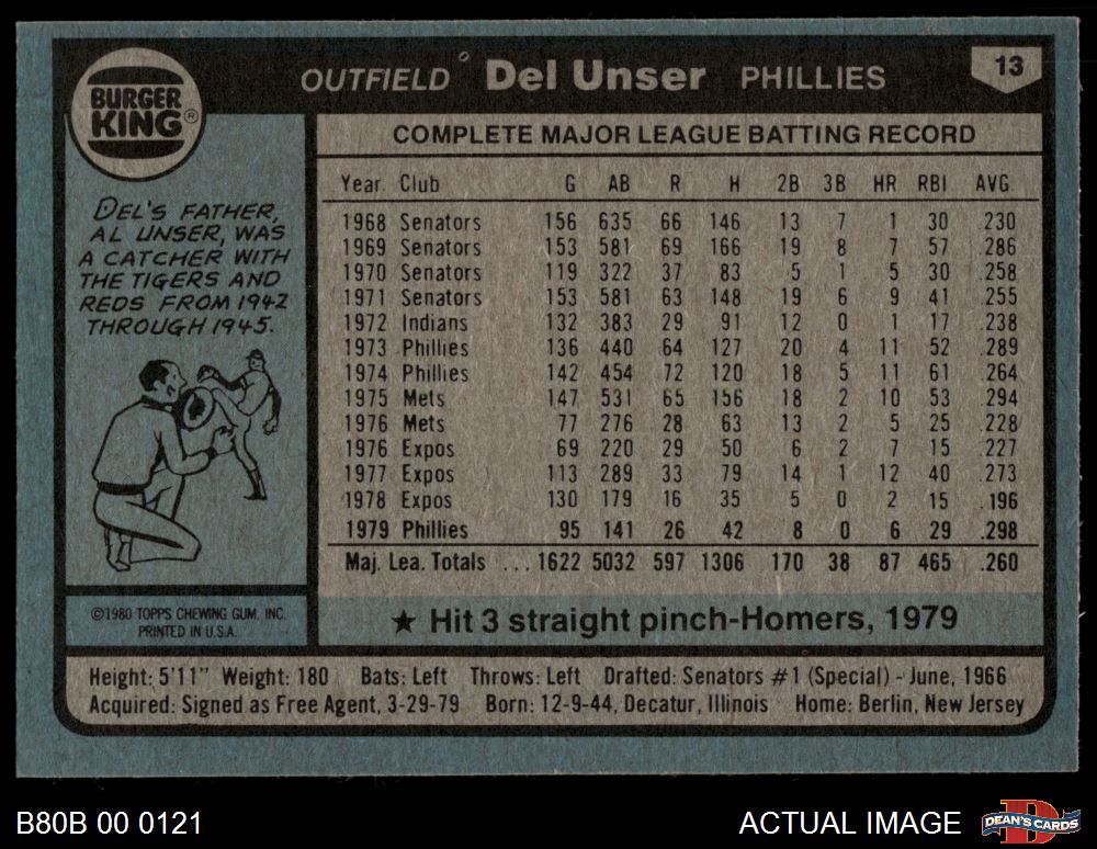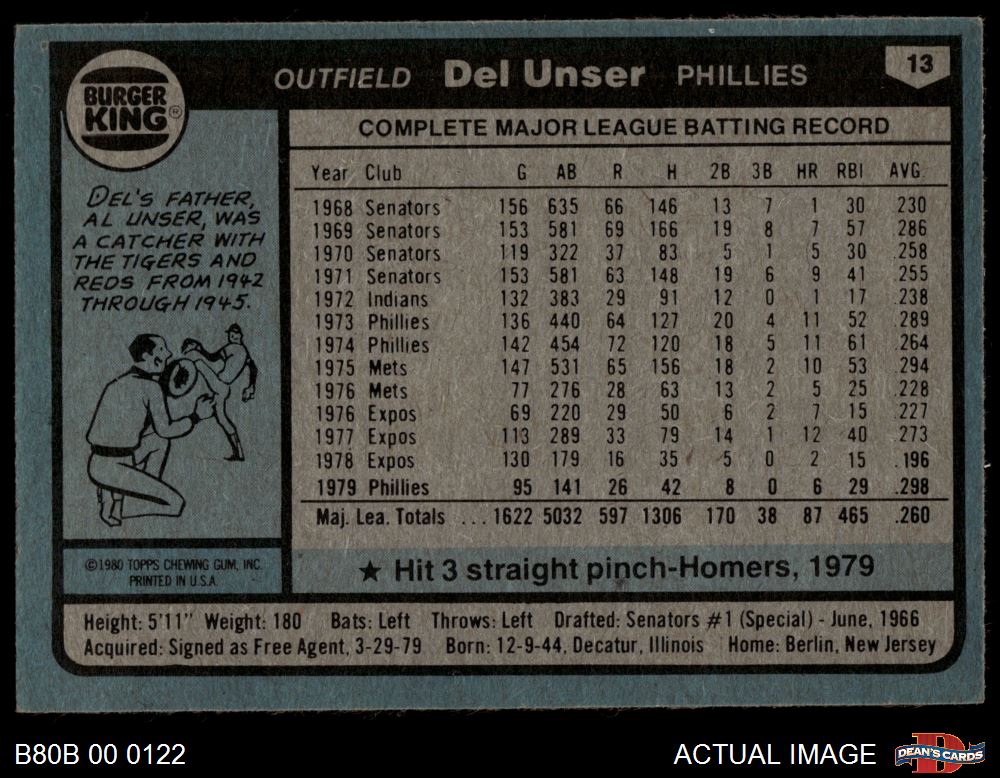 1980 Burger King Phillies #13 Del Unser 5 - EX