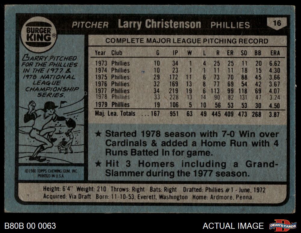 1980 Burger King Phillies #16 Larry Christenson