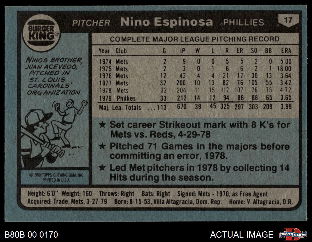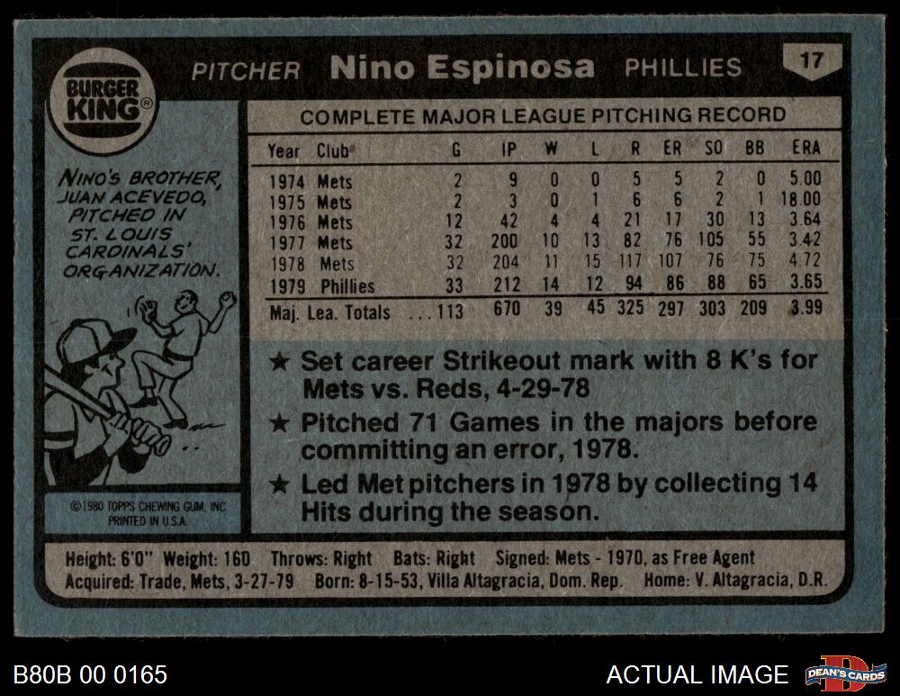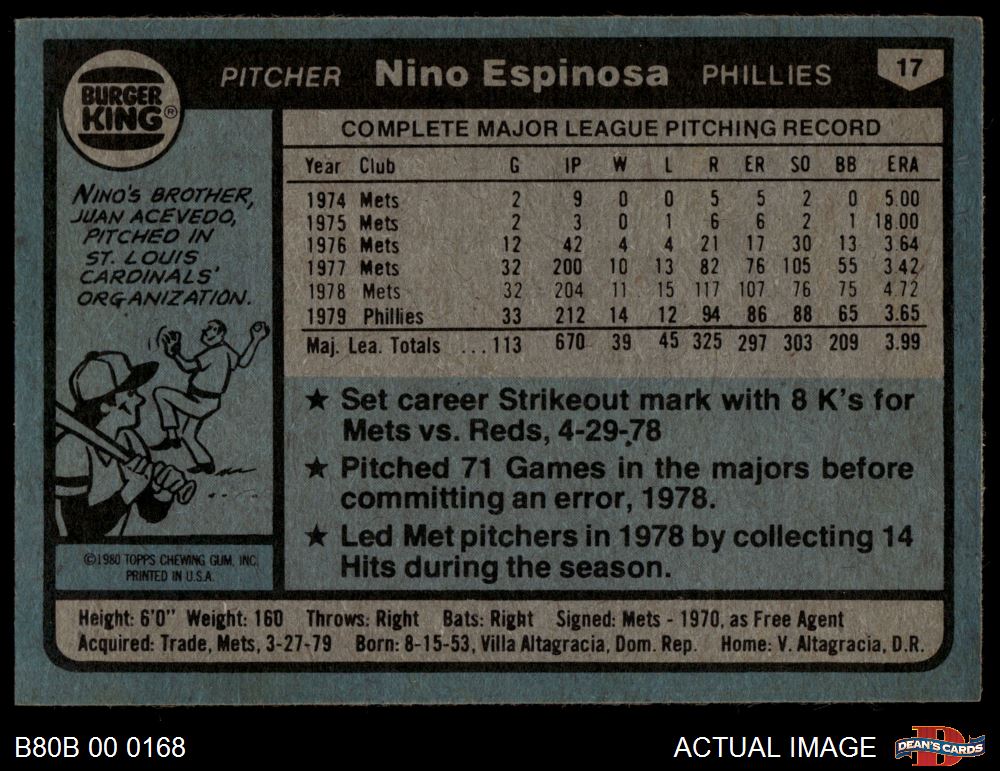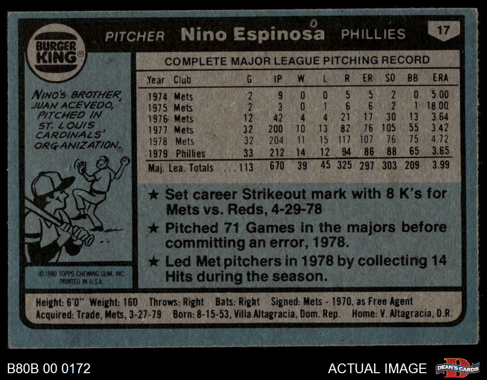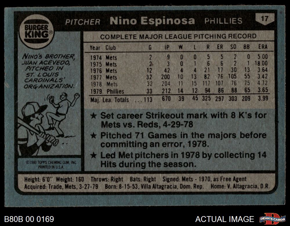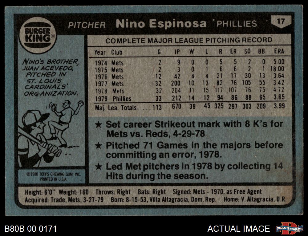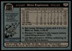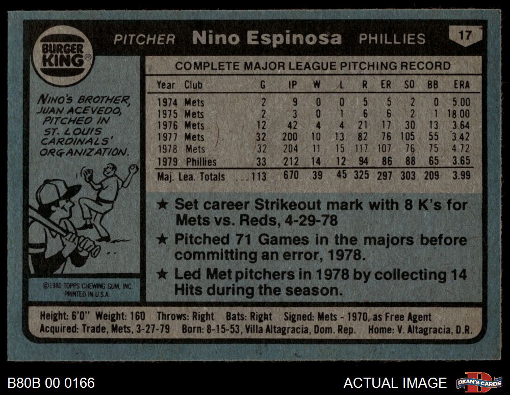 1980 Burger King Phillies #17 Nino Espinosa