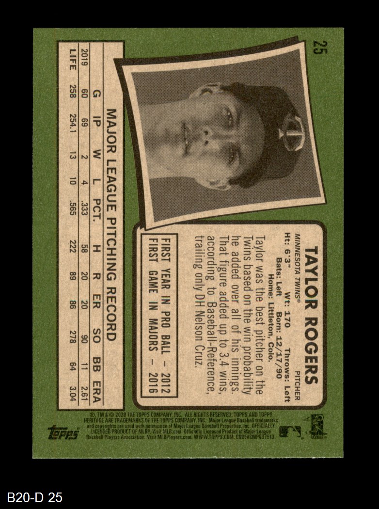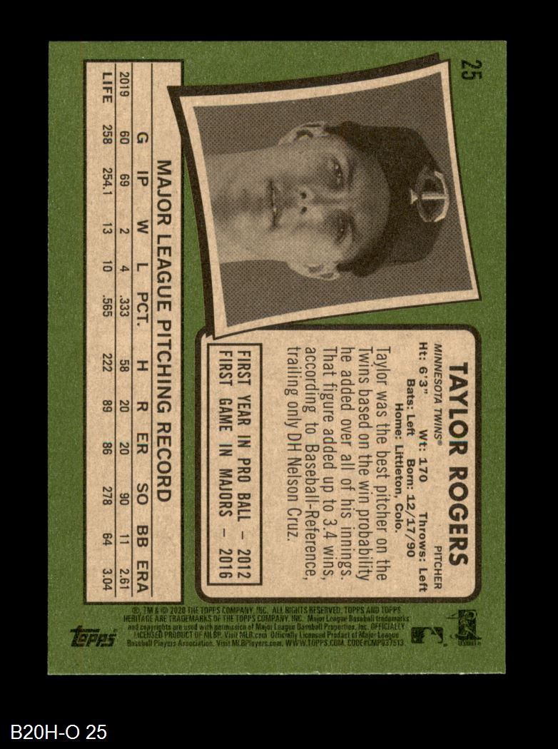 2020 Topps Heritage #25 Taylor Rogers 8 - NM/MT