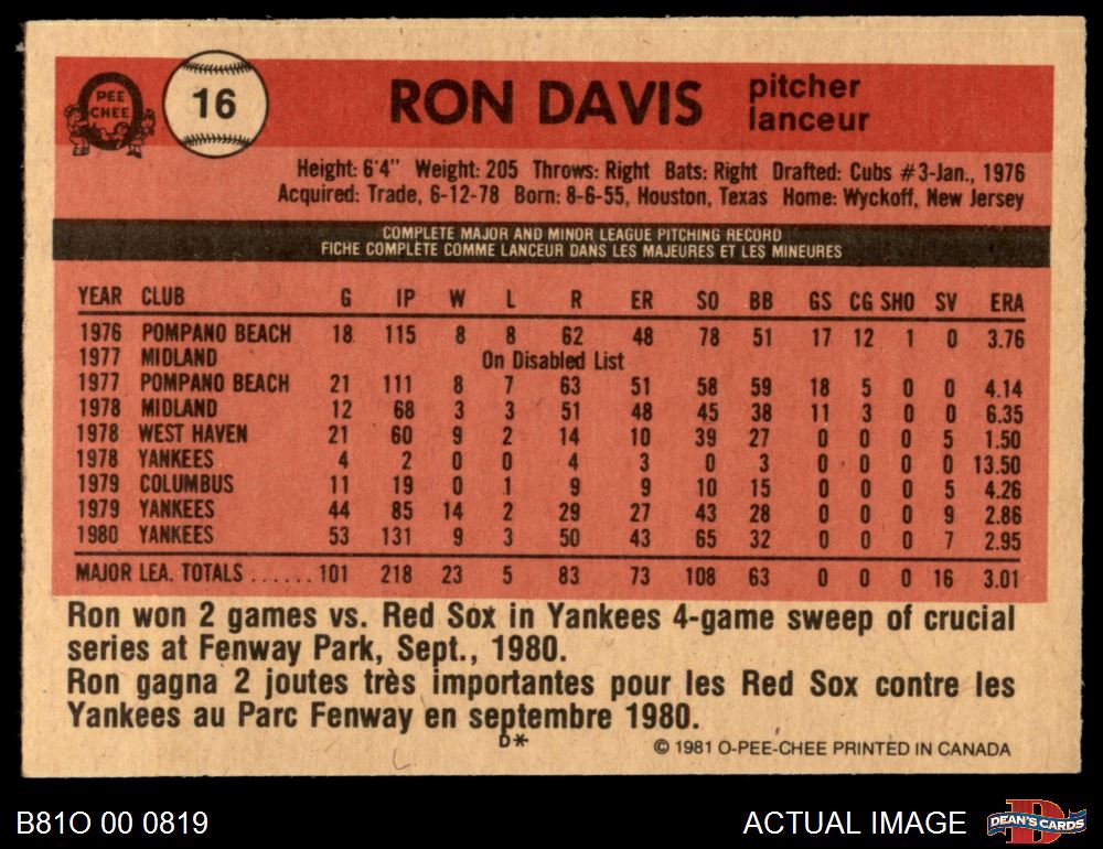 1981 O-Pee-Chee #16 Ron Davis 6 - EX/MT