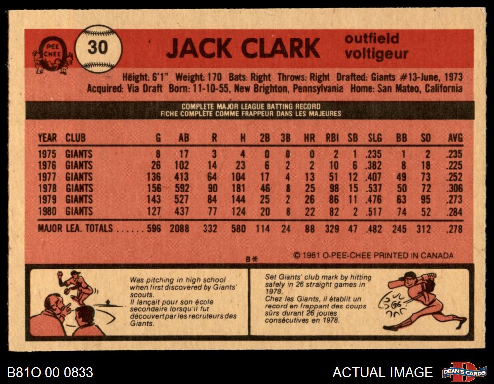 1981 O-Pee-Chee #30 Jack Clark 7 - NM