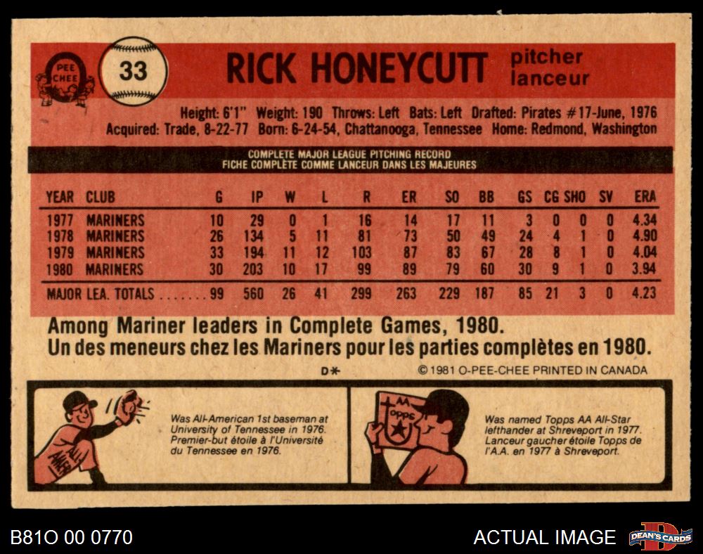 1981 O-Pee-Chee #33 Rick Honeycutt 7 - NM