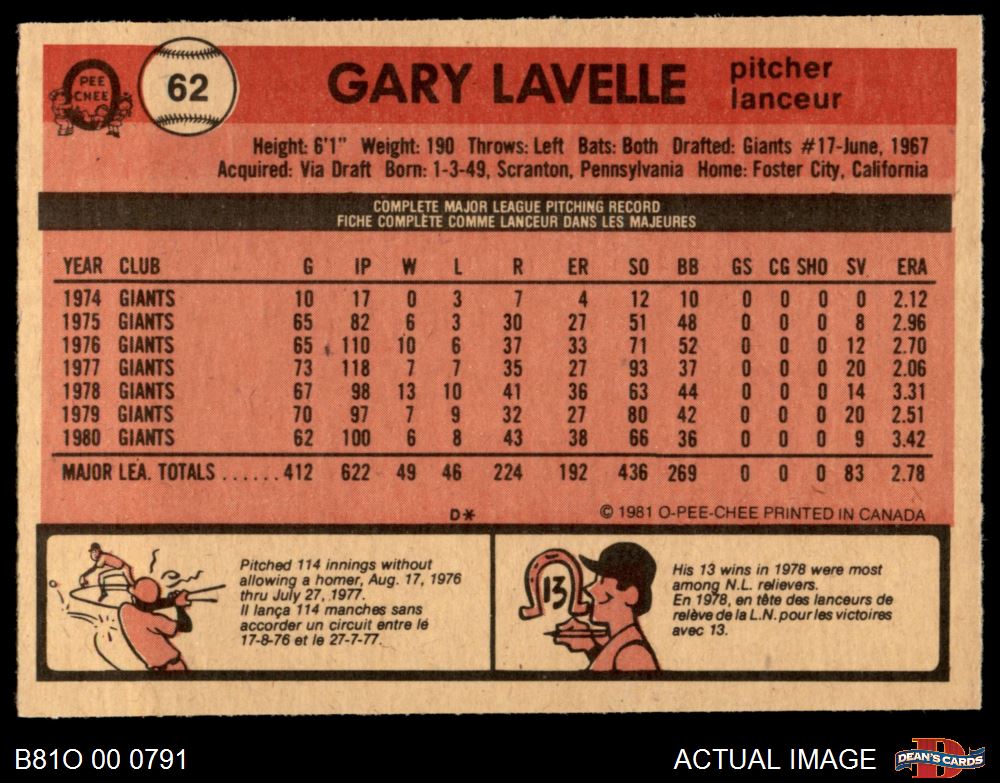 1981 O-Pee-Chee #62 Gary Lavelle 7 - NM