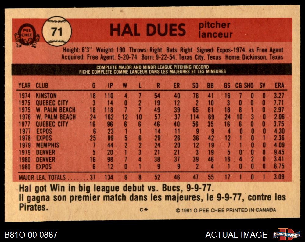 1981 O-Pee-Chee #71 Hal Dues 6 - EX/MT