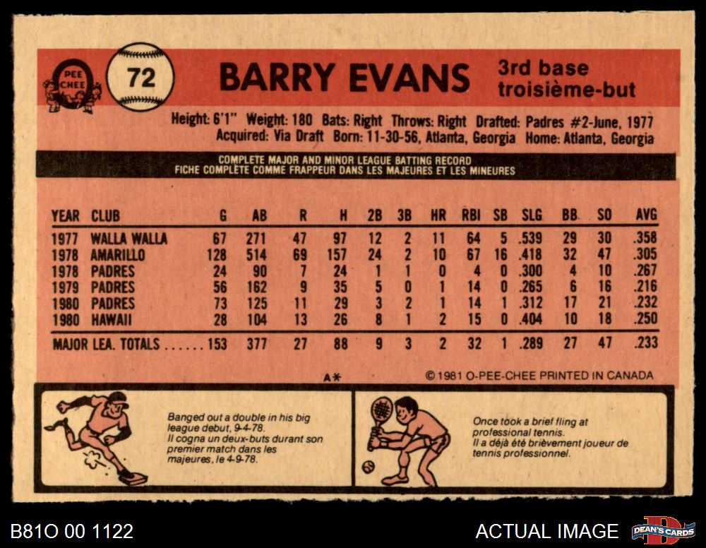 1981 O-Pee-Chee #72 Barry Evans 3 - VG