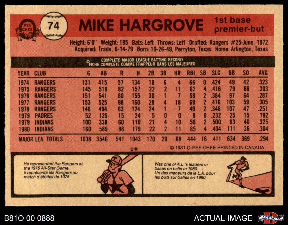 1981 O-Pee-Chee #74 Mike Hargrove 8 - NM/MT