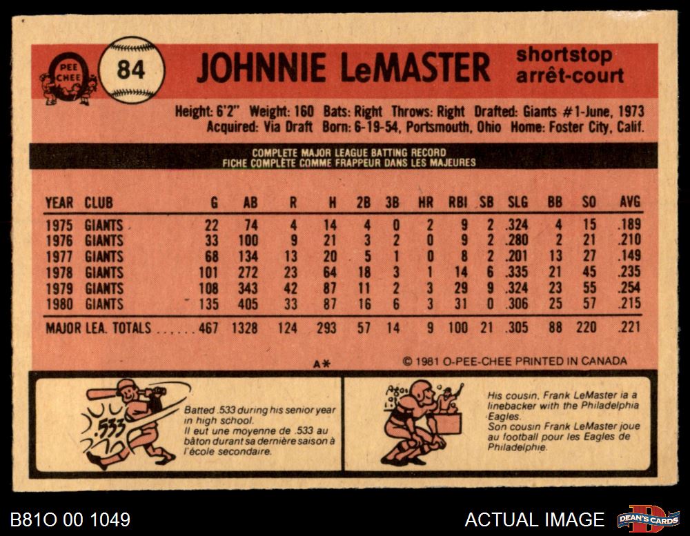 1981 O-Pee-Chee #84 Johnnie LeMaster 7 - NM