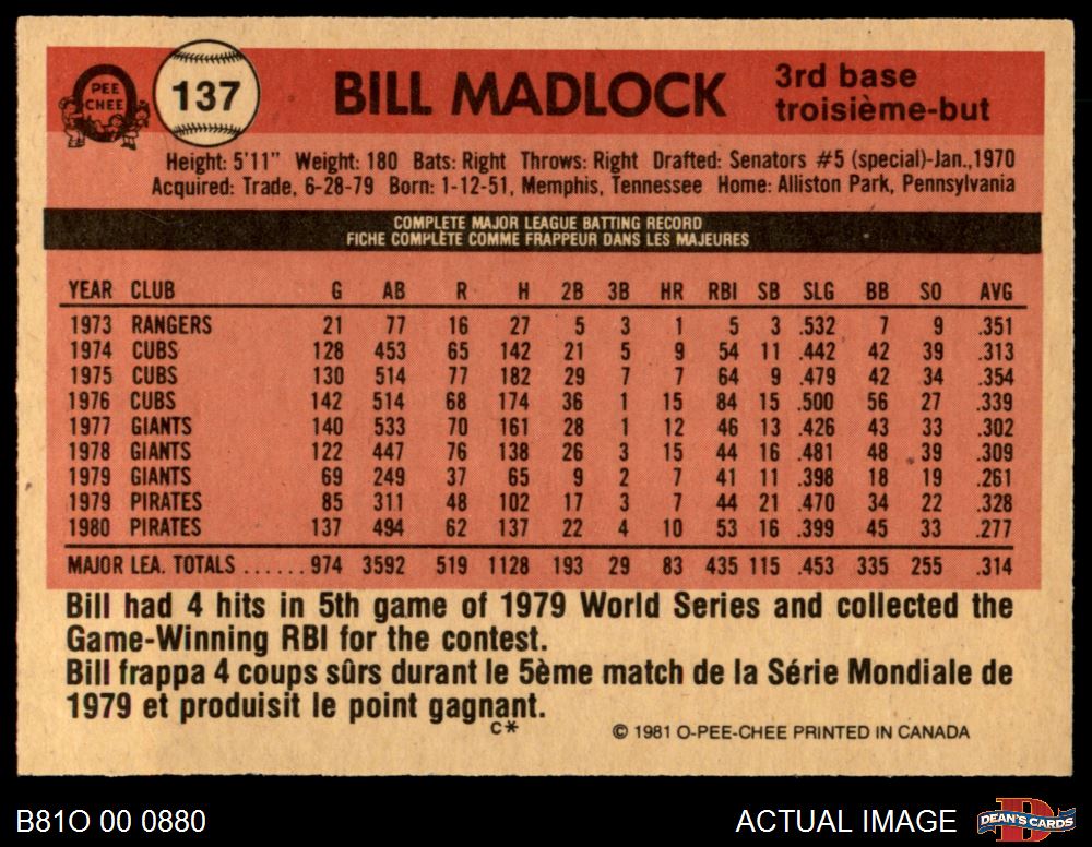 1981 O-Pee-Chee #137 Bill Madlock 8 - NM/MT