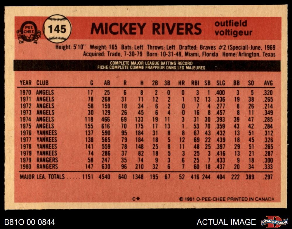 1981 O-Pee-Chee #145 Mickey Rivers 6 - EX/MT