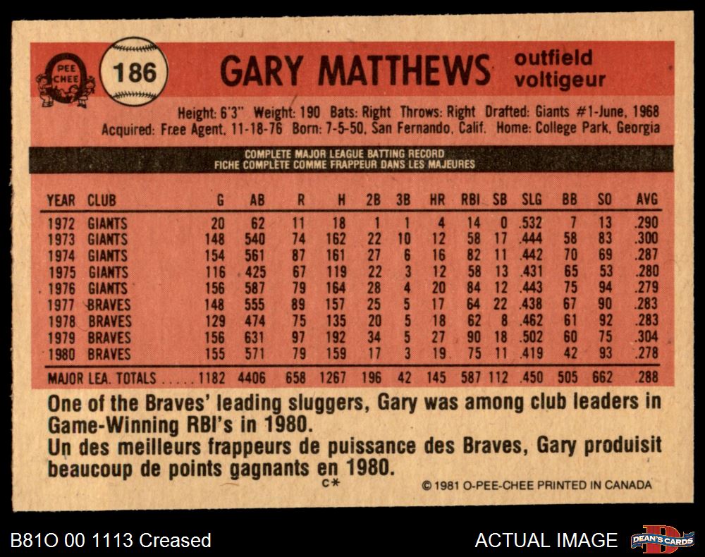1981 O-Pee-Chee #186 Gary Matthews 3 - VG