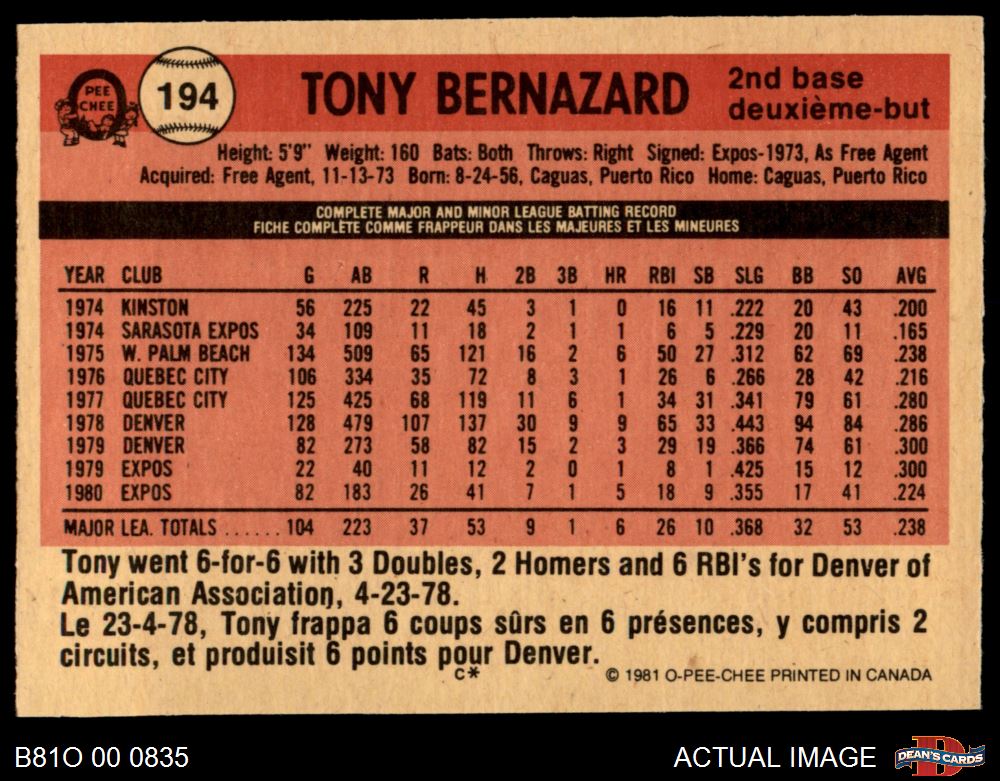 1981 O-Pee-Chee #194 Tony Bernazard 8 - NM/MT