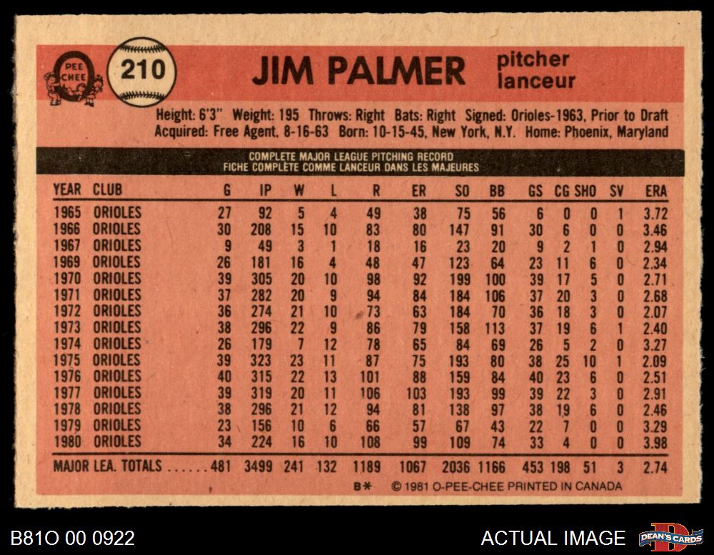 1981 O-Pee-Chee #210 Jim Palmer 5 - EX