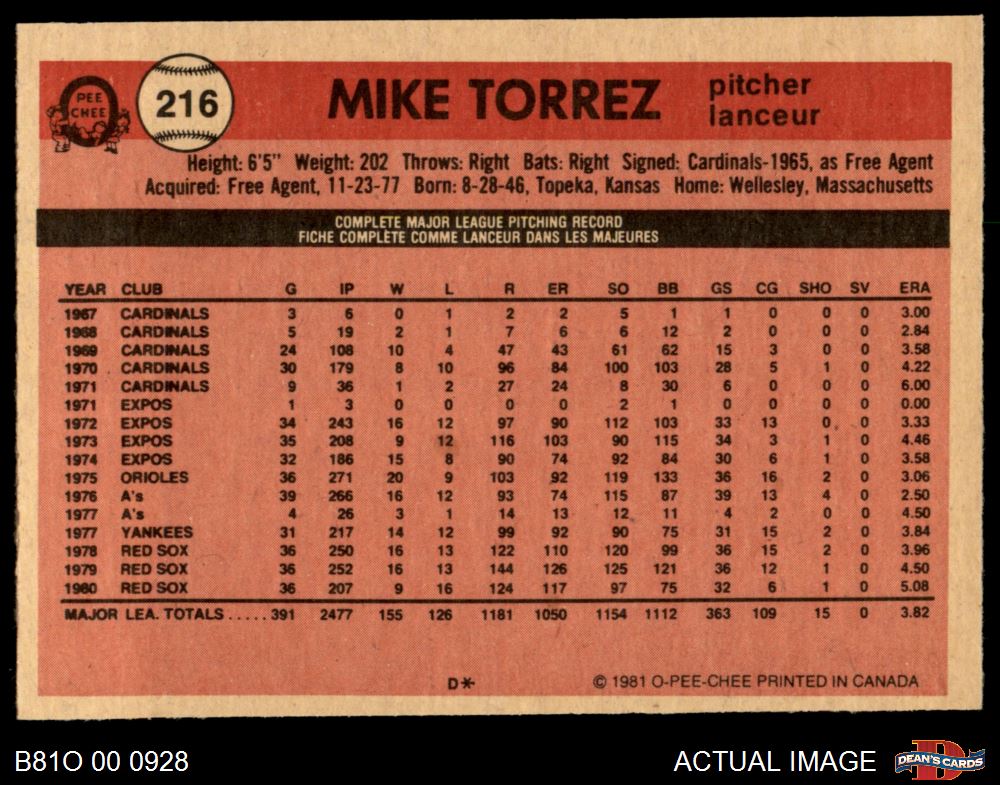 1981 O-Pee-Chee #216 Mike Torrez 4 - VG/EX