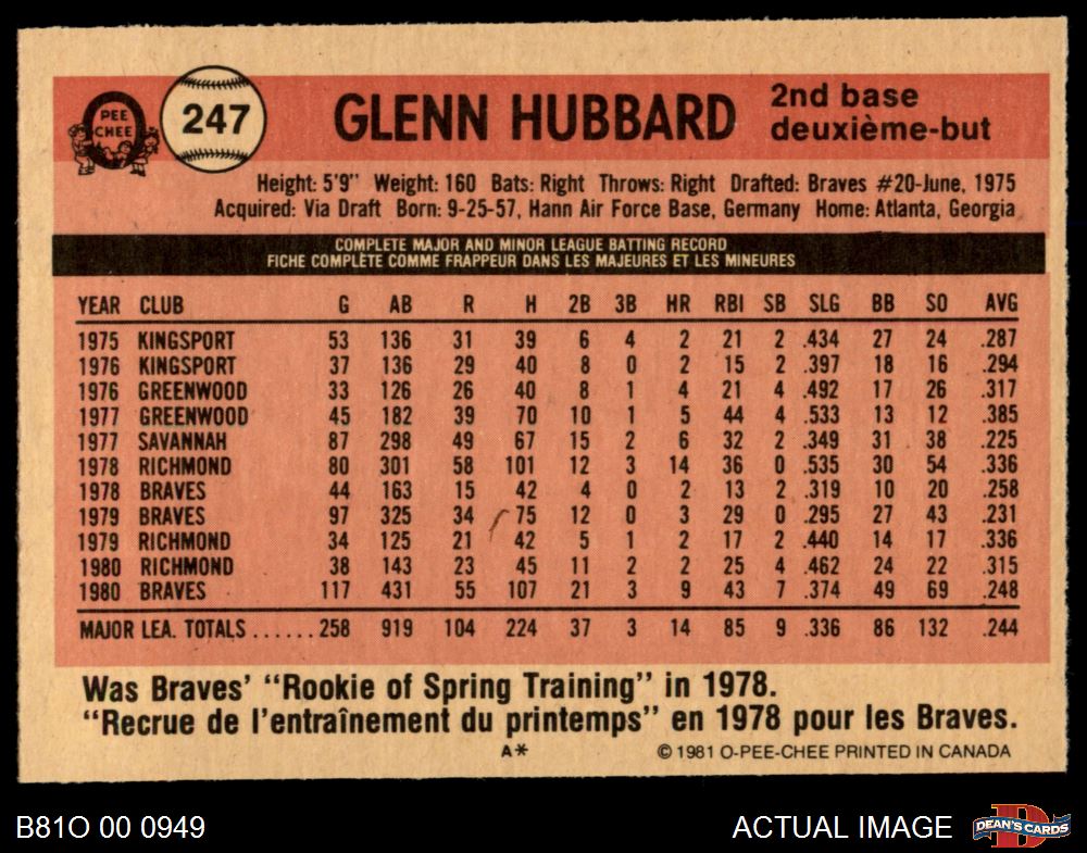1981 O-Pee-Chee #247 Glenn Hubbard 3 - VG