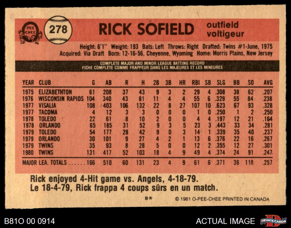 1981 O-Pee-Chee #278 Rick Sofield 6 - EX/MT