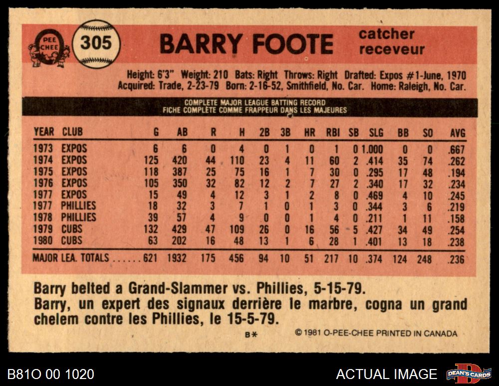 1981 O-Pee-Chee #305 Barry Foote 7 - NM