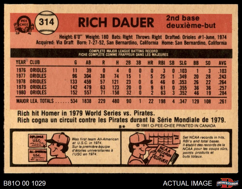 1981 O-Pee-Chee #314 Rich Dauer 6 - EX/MT