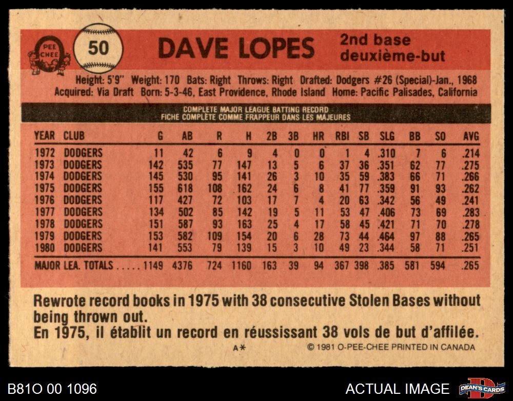 1981 O-Pee-Chee #50 - Dave Lopes All-Star Game 6 - EX/MT