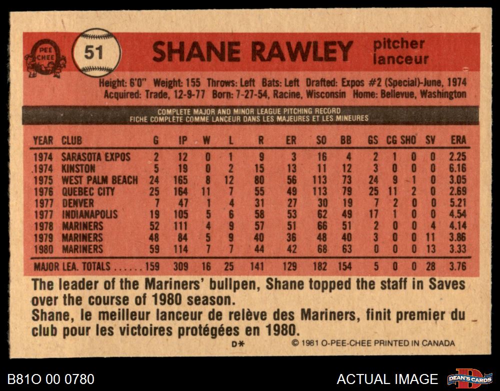 1981 O-Pee-Chee #51 Shane Rawley
