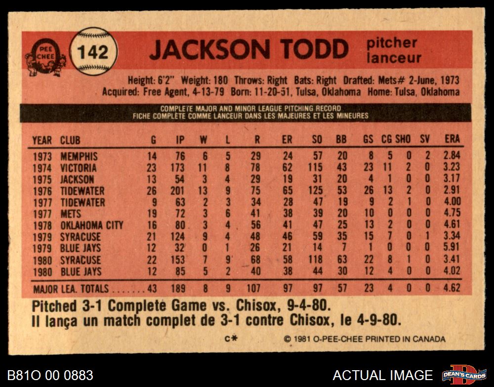1981 O-Pee-Chee #142 Jackson Todd 7 - NM