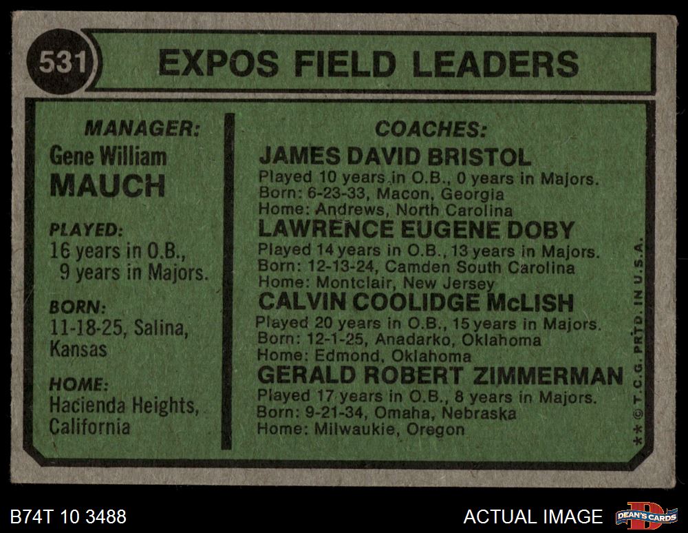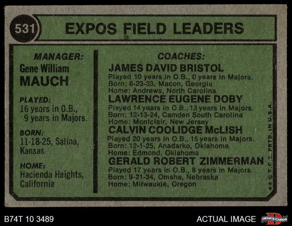 1974 Topps #531 - Gene Mauch / Dave Bristol / Larry Doby / Cal McLish / Jerry Zimmerman Expos Leaders 4 - VG/EX