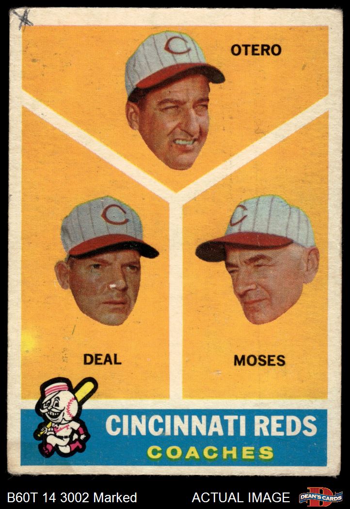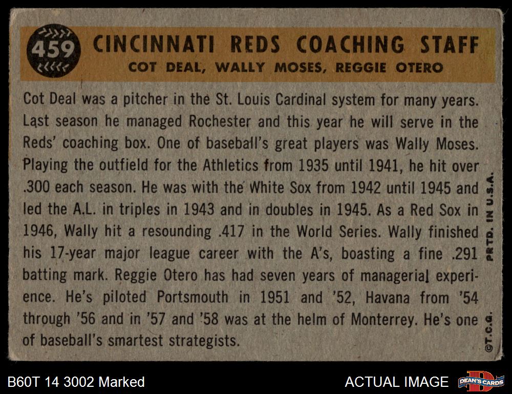 1960 Topps #459 - Reggie Otero / Cot Deal / Wally Moses Reds Coaches AUTHENTIC