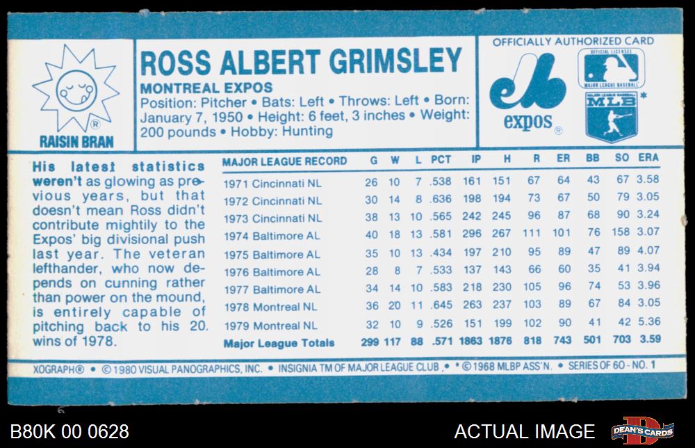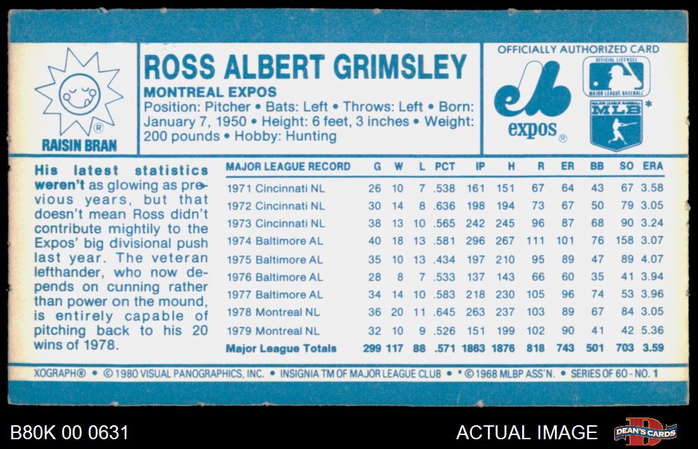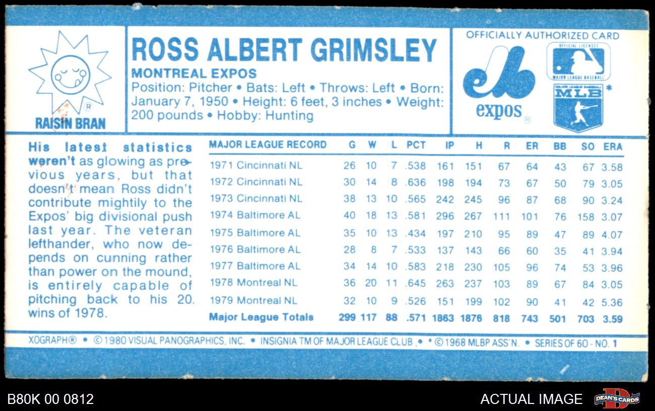 1980 Kelloggs #1 Ross Grimsley 2 - GOOD