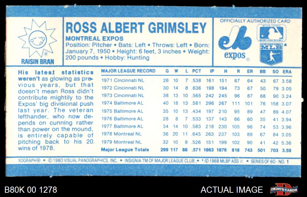 1980 Kelloggs #1 Ross Grimsley 8 - NM/MT