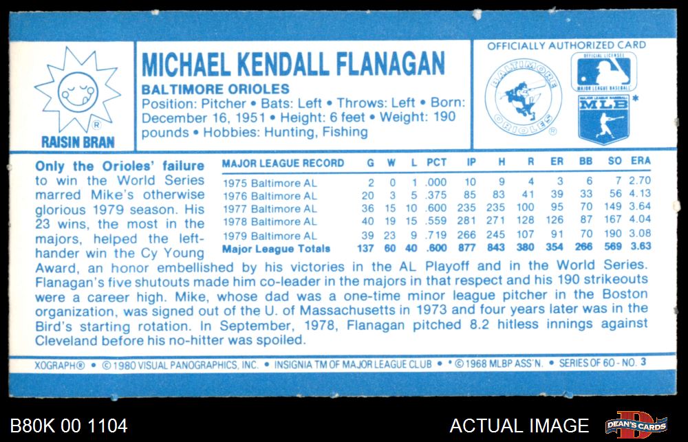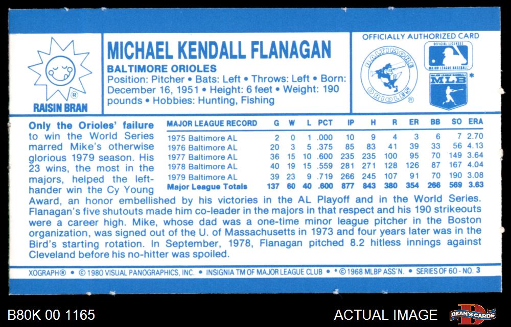 1980 Kelloggs #3 Mike Flanagan 8 - NM/MT
