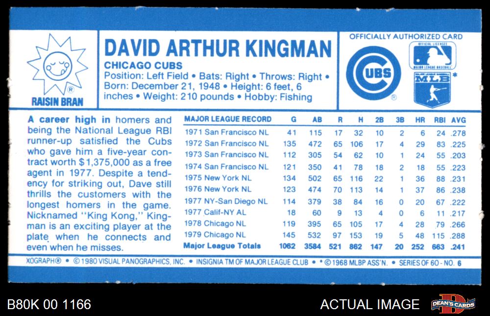 1980 Kelloggs #6 Dave Kingman 8 - NM/MT