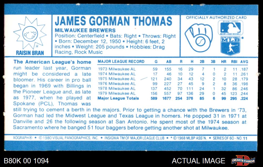1980 Kelloggs #11 Gorman Thomas 8 - NM/MT