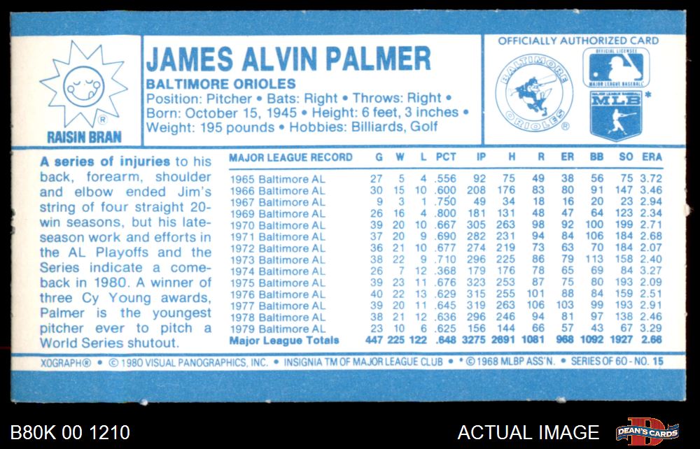 1980 Kelloggs #15 Jim Palmer 8 - NM/MT