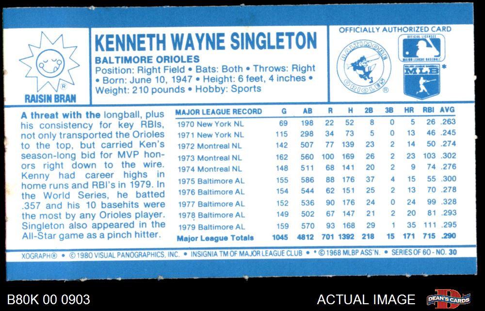 1980 Kelloggs #30 Ken Singleton 8 - NM/MT