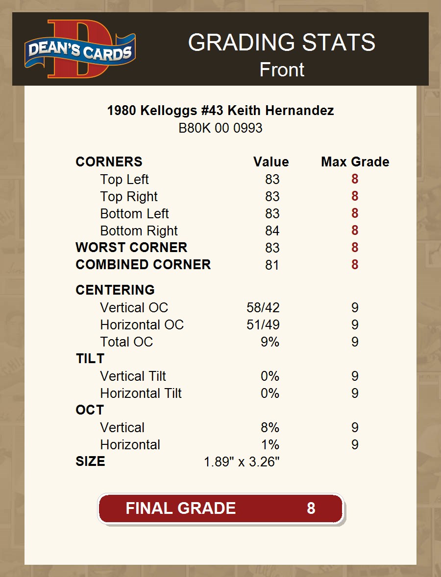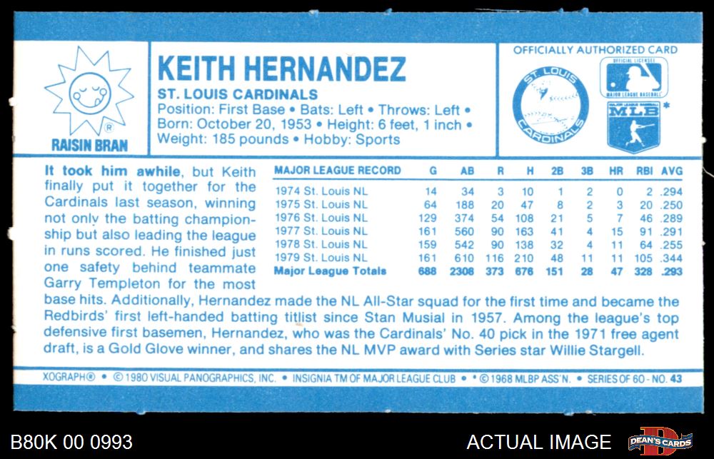 1980 Kelloggs #43 Keith Hernandez 8 - NM/MT