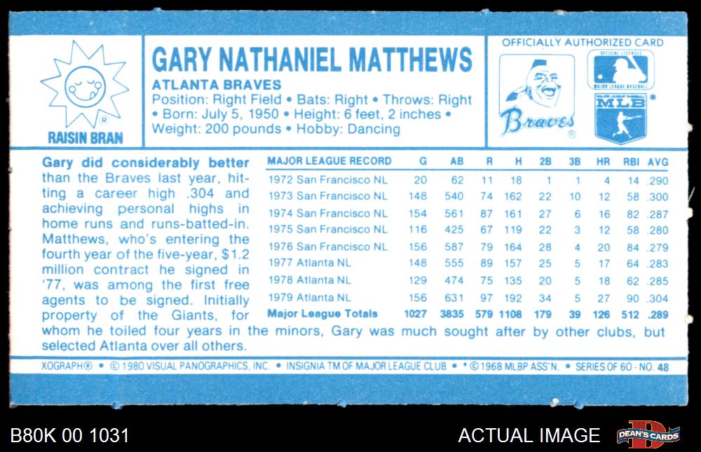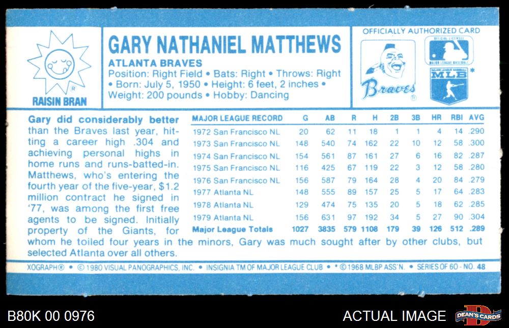 1980 Kelloggs #48 Gary Matthews 8 - NM/MT