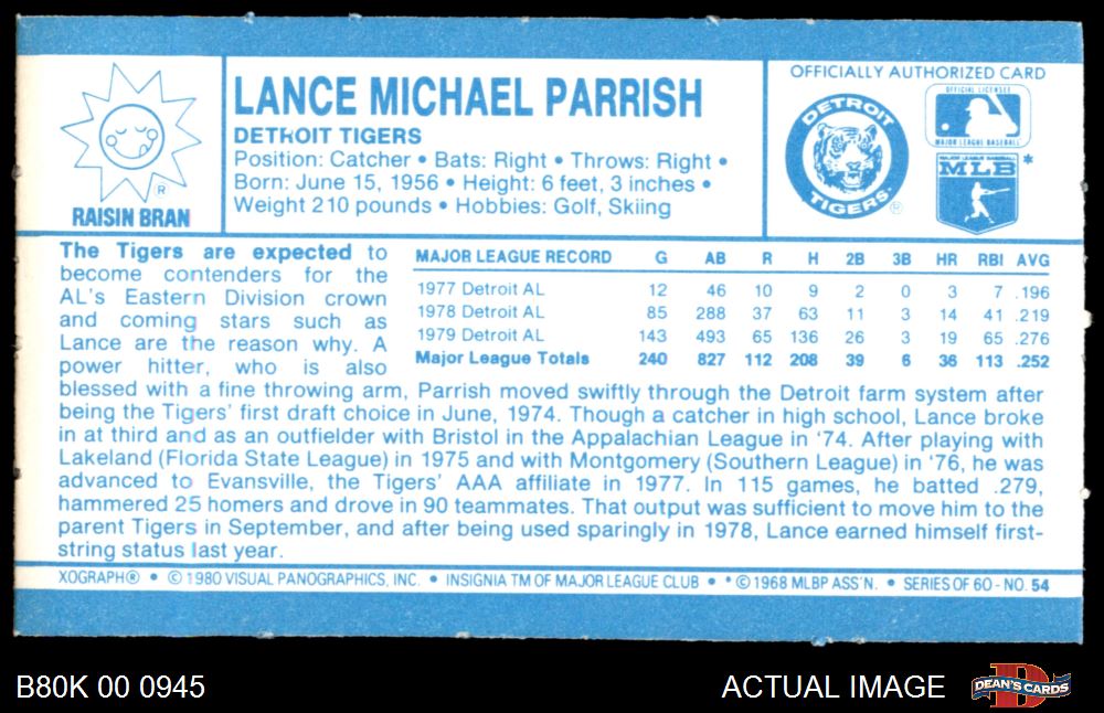 1980 Kelloggs #54 Lance Parrish 8 - NM/MT