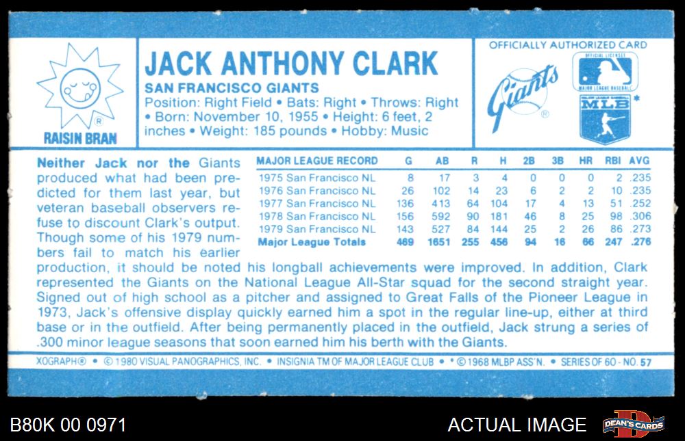 1980 Kelloggs #57 Jack Clark 8 - NM/MT